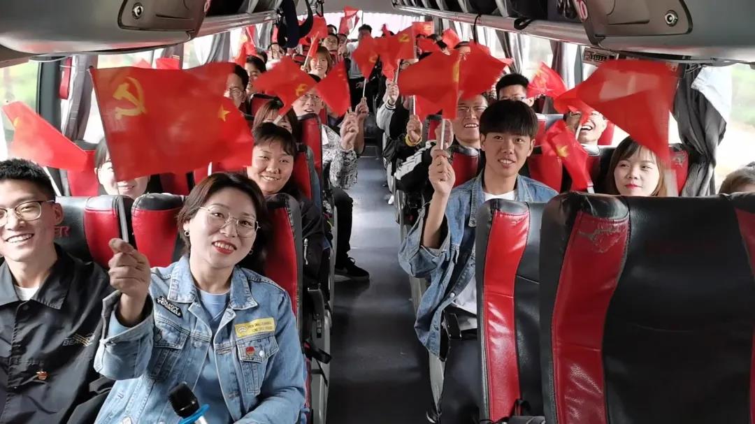 在车上的时候,支部书记郭老师组织大家一起合唱。感情激昂,气氛欢快,同志们手里的小红旗也挥动了起来。展现了我们这代青年人的青春朝气。